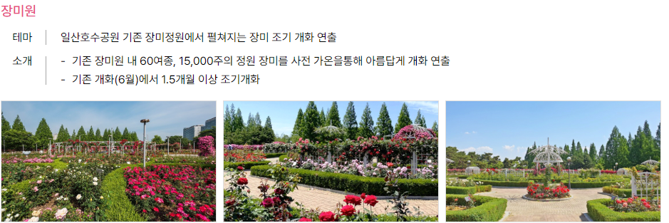 -기존 장미원 내 60여 종, 15,000주의 장미를 사전 가온을 통해 아름답게 개화연출