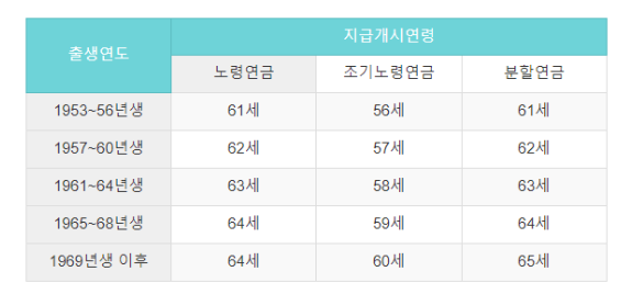 출생연도에 따라서 받을수 있는 수령나이가 모두 다릅니다. 이유는 우리가 직장에서 퇴직하는 은퇴나이가 점점 늦춰지고 있기 때문입니다. 현재는 맨 아래 구간인 65세 해당됩니다.