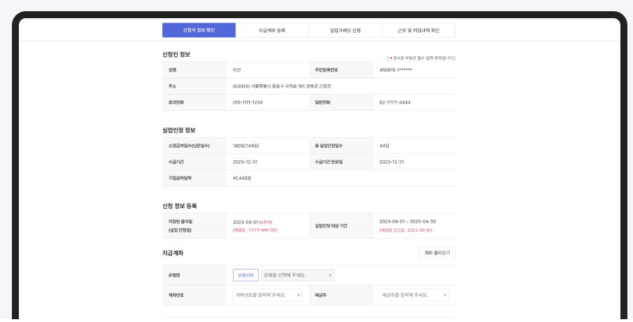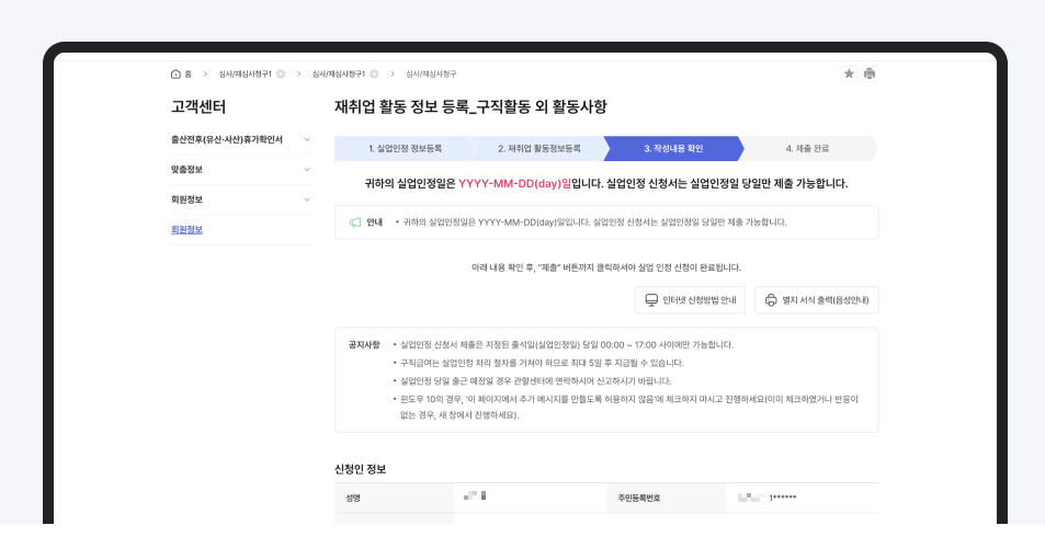신청인 정보, 실업인전정보, 신청정보를 확인하시고, 산업재해 요양 신청자 또는 요양 중 휴업급여 수급자이거나, 전산장애 등으로 지정된 출석일 (실업인정일) 당일 17:00까지 신청하지 못하신 분은 관할 센터를 방문하시면 됩니다.