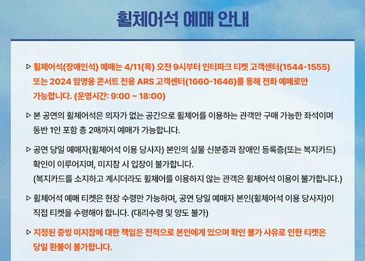 참고로 휘체어석 예매는 하루뒤인 4월 11일 오전 9시부터 인터파크 고객센터를 통해 현장 수령으로만 예매 가능 하다고 합니다.
